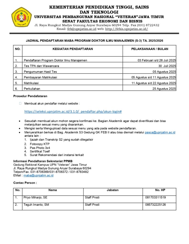 Jadwal Penerimaan Mahasiswa Baru Program Doktor Ilmu Manajemen Semester Gasal TA. 2025/2026